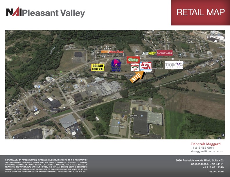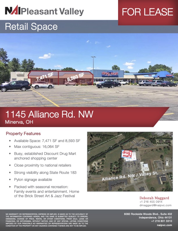 Retail space for lease, 1145 Alliance Rd. NW, Minerva, OH 44657. Two spaces available: 7,471 square feet and 8,593 square feet, in busy, established Discount Drug Mart anchored shopping center. For more information, contact NAI https://naipvc.com/